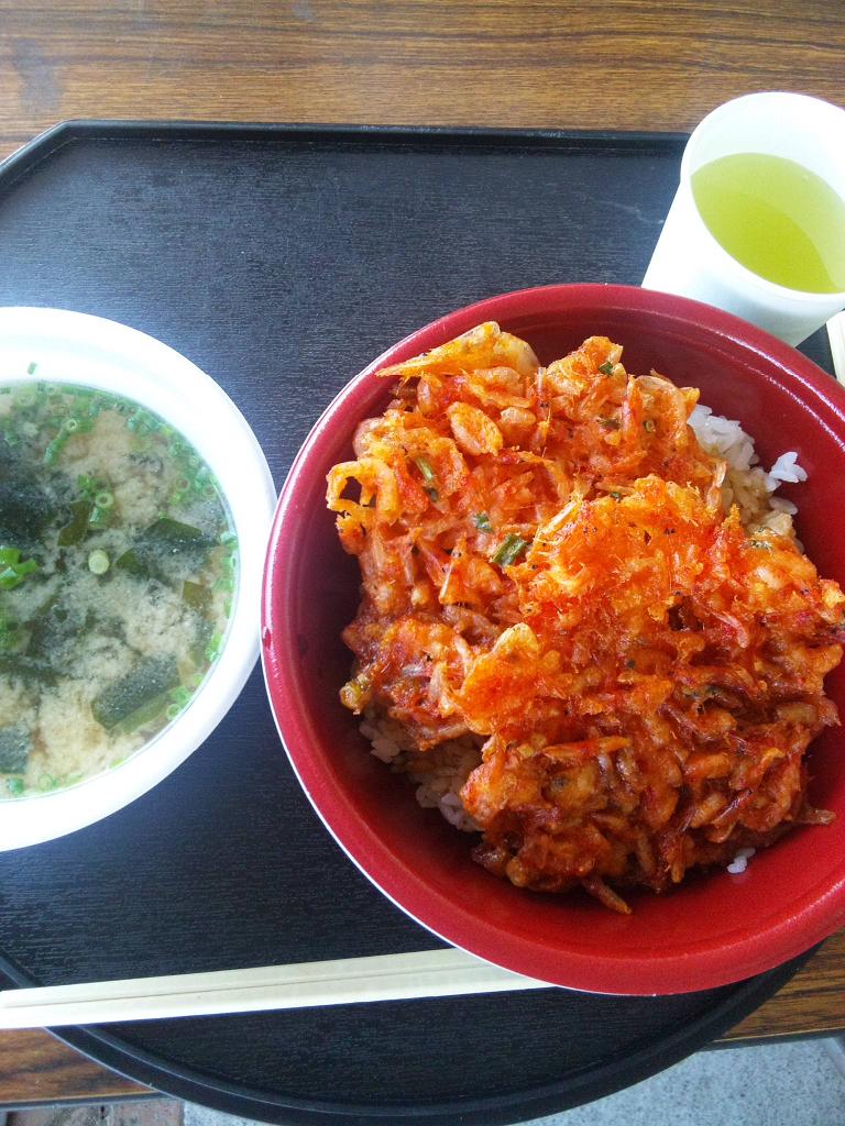 ←桜えびのかき揚げ丼。横にある桜えびで出汁をとったお味噌汁は商品やのに、お店のおばちゃんがサービスしてくれた!これも平日に行った特典かな。