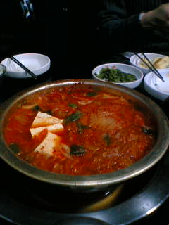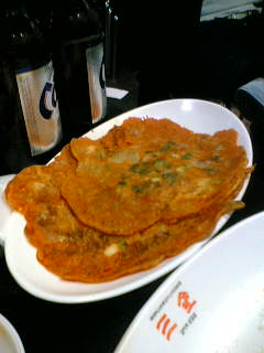 明洞で晩ご飯。キムチ鍋と韓国チヂミを食べた。